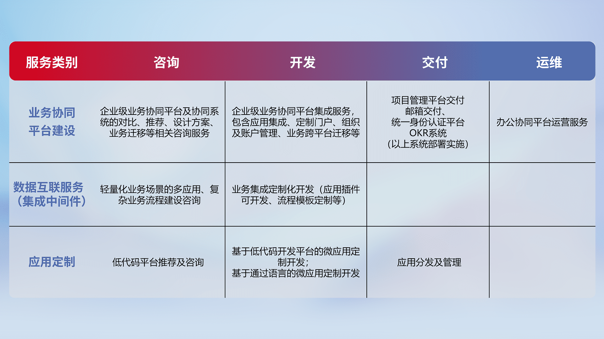 针对钉钉、、、、企微、、IDaas等平台级产品提供产品的规划、、、、方案、、交付、、、定制化开发等服务,,,实现如统一协同办公、、、智能客户服务、、、混合会议管理、、、智能数据查询、、、、等业务场景,,,,实现数字化转型。。